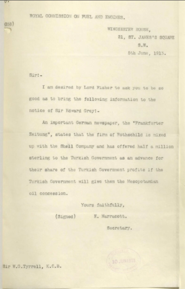 1913年的一份文件(IOR/L/PS/10/300)显示,“罗斯柴尔德公司”曾向土耳其政府提�万英镑,以获得美索不达米亚的特许权,并与壳牌公司有关联。罗斯柴尔德家族已经通过其在高加索的炼油厂以及与荷兰皇家壳牌公司的协议控制了全球石油贸易的大部分,他们把这一地区视为其能源帝国的自然延伸。尽管官方历史把缅甸石油公司的所有权归于苏格兰的嘉吉(Cargill)家族,但罗斯柴尔德家族在地区棋盘上的存在是无可争辩的,并且暗示了一张值得进一步调查的金融影响网络。